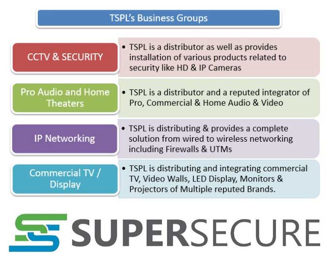 TSPL’s operations are spread across five main industry groups namely CCTV, Audio, Networking and Video (Commercial TV, Projectors, Video Walls). The different business groups and practice areas within TSPL form our matrix of service offerings. Multi-disciplinary teams are used on most assignments. The diversity of experience in TSPL teams helps it to adopt a creative and cross-functional approach to problem solving, which has not only been very successful in practice, but has also been well appreciated by all our clients.